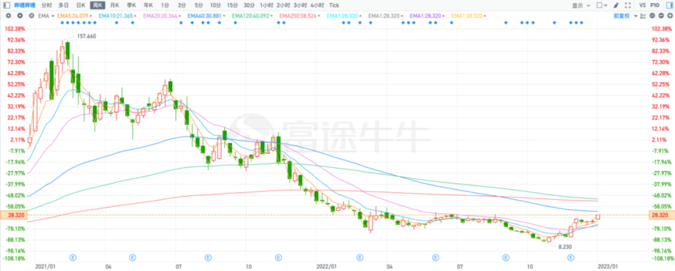 资本市场也给出了自己的态度,自2021年2月以来B站美股股价经历崩盘式暴跌,从最高157.66美元/股跌到最低8.23美元/股,市值一度蒸发3000多亿元。