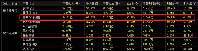 截至2021年年末,畜禽饲料销售、特水饲料销售、水产品销售、原料销售、鳗鲡养殖分别占营收比重为63.31%、28.38%、4.79%、1.71%、1.19%。