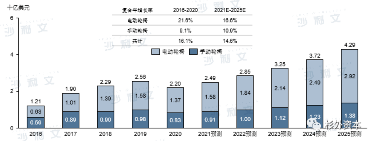 在下游终端用户强劲需求的推动下,到2025年底,全球轮椅的总销售价值预计将达到约133.4亿美元,2021年至2025年的复合年增长率为14.1%。