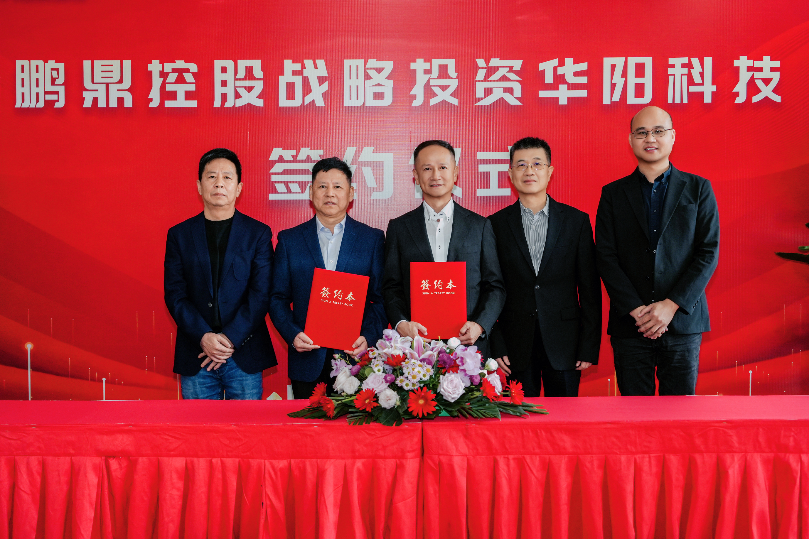 (左一:华阳科技副董事长徐荣灿先生;左二:华阳科技董事长&总经理朱荣惠先生;中间:鹏鼎控股总经理林益弘先生;右二:鹏鼎控股财务长萧得旺先生;右一:金鼎资本 创始合伙人何富昌先生)