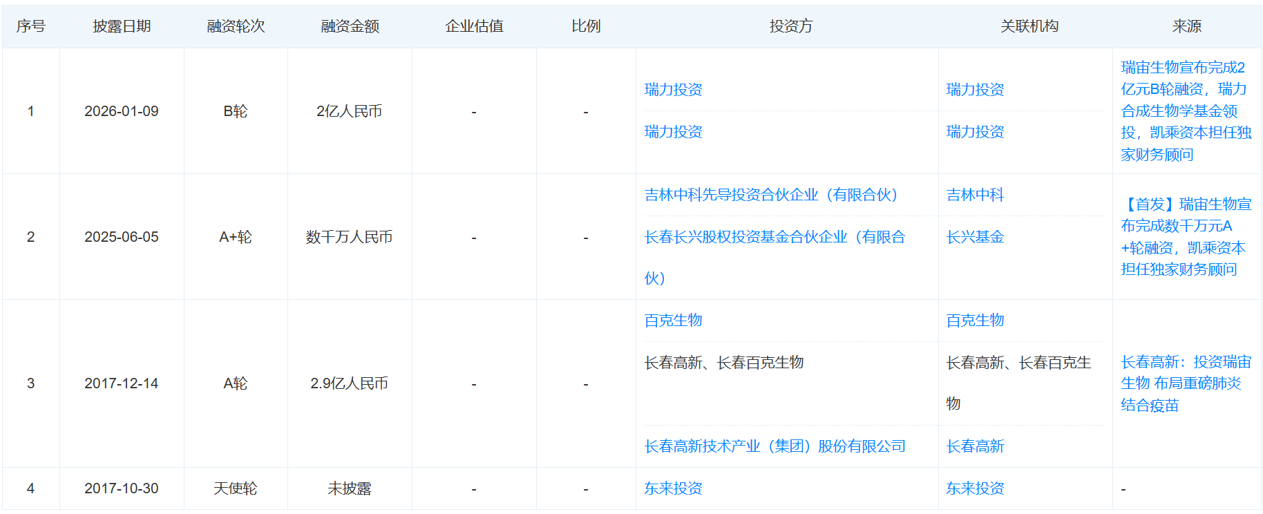 公开信息显示,2027年获得东来投资的天使轮融资及百克生物的A轮融资;2025年6月,瑞宙生物完成数千万元A+轮融资,由长兴基金投资;再到2026年1月的B轮融资,由瑞力合成生物学基金领投。