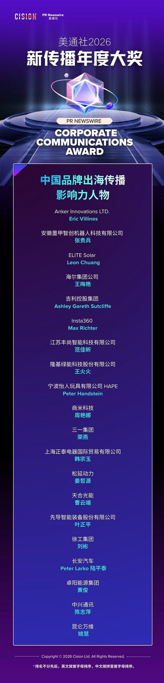 论坛结束后,2026美通社新传播大奖获奖名单揭晓。本次大奖共设19个奖项类别,涵盖内容策略、内容制作、品牌影响力、海外传播、多媒体传播、传播洞察、团队贡献等领域,全面展示了2025年度企业传播领域的卓越成果。获奖名单见下图: