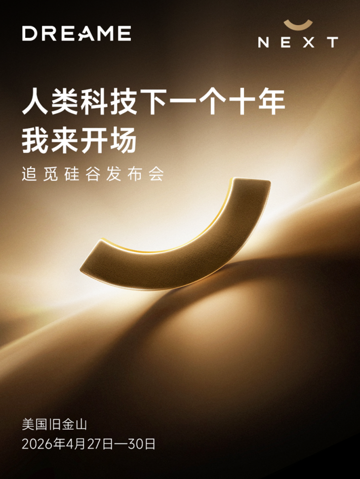 美国时间2026年4月27日至30日,全球高端科技品牌追觅科技将在美国硅谷召开以“DREAME NEXT”为主题的全球发布会,集中亮相智能汽车、智能家电、个人终端及个人护理等智能产品矩阵。